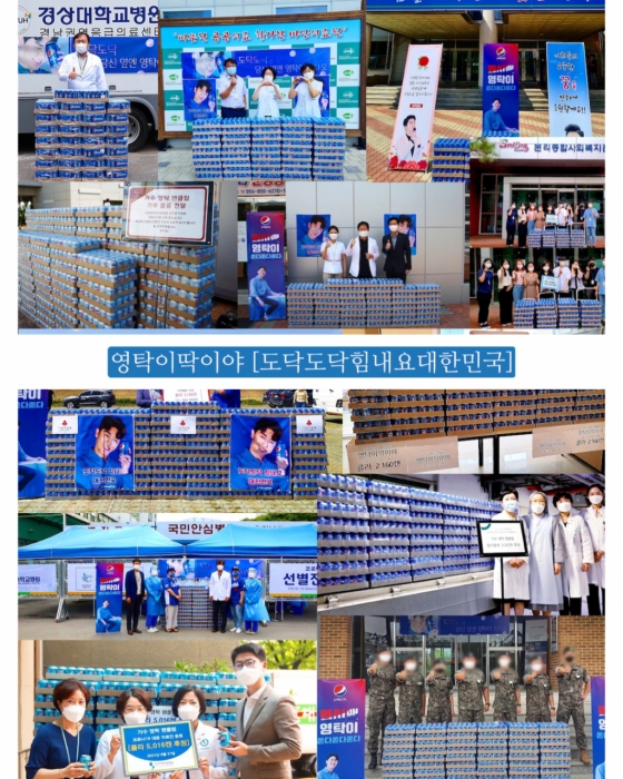'영탁이 딱이야'는 "'도닥도닥 힘내요 대한민국' 펩시 음료 기부 릴레이에서 만난 각계 각층의 고마운 분들께서 작은 나눔에도 오히려 더 큰 감사를 전하고 더욱 더 힘을 내겠다며 큰 용기로 돌려주셔서 무척 보람있었다"고 밝혔다.