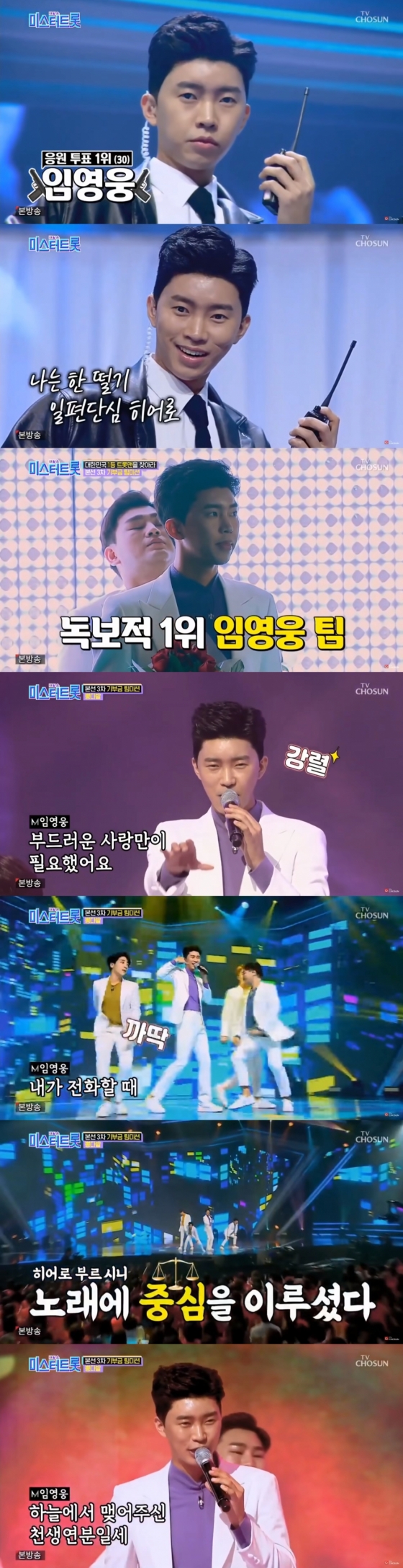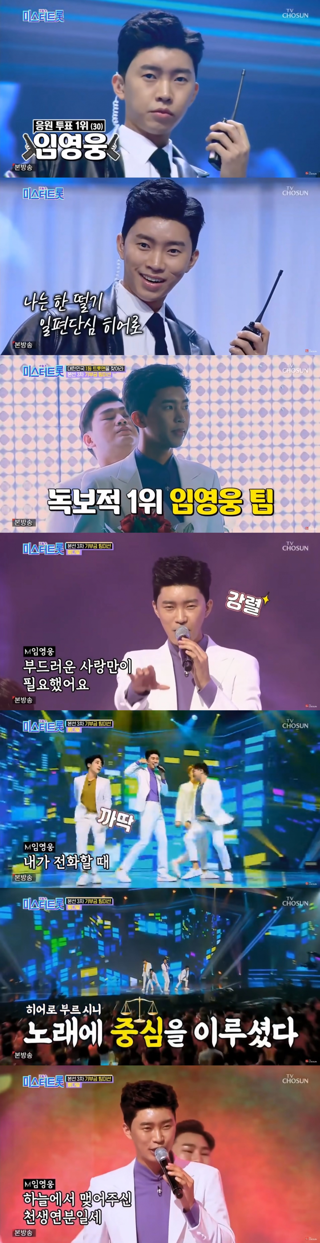 이날 리더로서 '뽕다발' 팀을 이끈 임영웅은 팀의 중심을 잡으며 빼어난 가창력과 환상적인 퍼포먼스로 팬심을 설레게 했다.