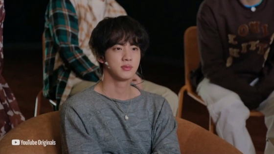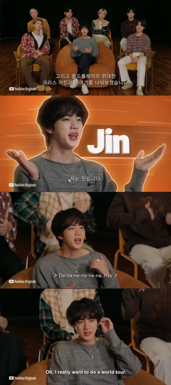 앞열의 가운데에 가장 큰 브라운 벨벳 쇼파에 앉은 진은 유튜브 셀카에 공개된 의상으로 편하게 앉아 자신의 이름을 소개한 후 영어로 '콜드 플레이의 위대한 크리스 마틴과 이야기를 나누어 보겠습니다'라며 밝은 목소리로 인터뷰의 막을 열었다.