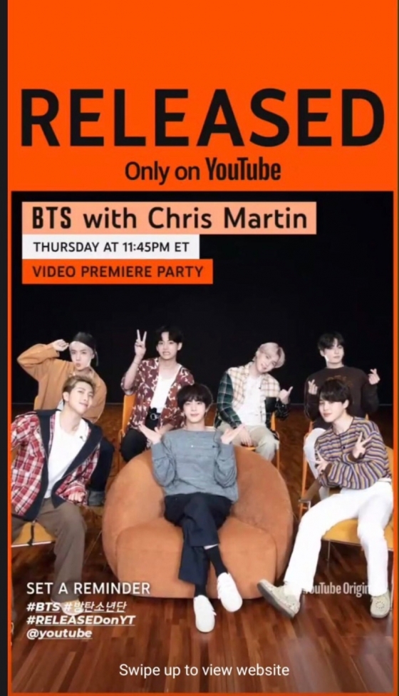 10일 오후 2시 유튜브 오리지널은 방탄소년단(BTS)과 콜드플레이의 크리스 마틴이 유튜브 쇼츠에서 진행된 '퍼미션 투 댄스 챌린지(PermissiontoDance challenge)' 에 대해 이야기하는 '릴리즈드(Released)' 스페셜 에피소드를 공개했다.