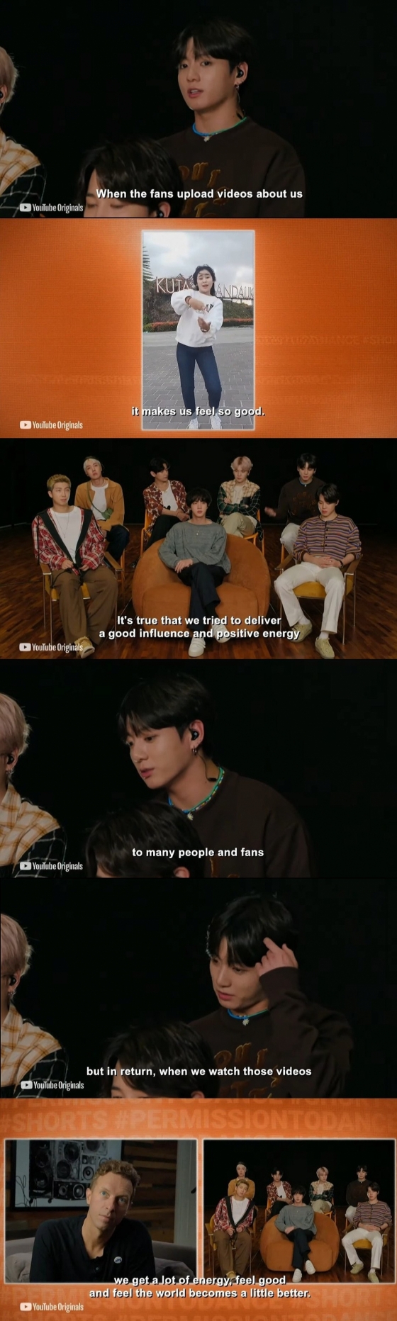 정국은 "그리고 저희가 많은 사람들에게, 많은 팬분들에게 좋은 영향이나 긍정적인 에너지나 이런 것을 전달하려고 했던 것은 맞지만 반대로 그런 영상을 보면 세상이 맑아지는 그런 느낌을 얻는다"라며 Permission to Dance 챌린지로 인해 역으로 긍정적이고 좋은 에너지, 영향을 받았다고 밝혔다.