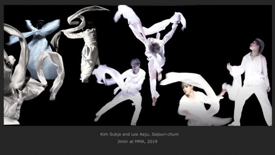 방탄소년단(BTS) 지민의 예술성 높은 퍼포먼스가 한국 전통춤 '살풀이춤'과 결합한 예술 작품으로 재탄생 되어 예술의 전당에서 전시되고 있다.