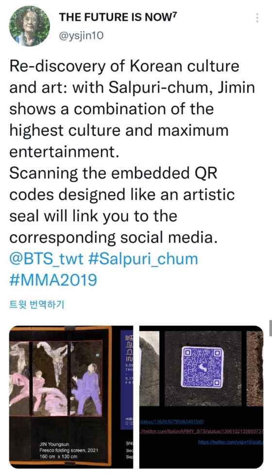 한편, 지민을 모티브로 한 작품이 예술의 전당에 전시되는 기념비적 소식에 팬들은 'JIMIN is ART', '예술의 전당 입성이라니 역시 예술가들의 뮤즈', '지민 그 자체가 예술입니다', '부채춤에 이어 살풀이춤까지 지민은 한국 전통춤 세계화 1등 공신', '작품을 실제로 보니 더 감동적이에요', '영구보존 해야할 지민의 작품들'등 뜨겁게 반응하고 있다.