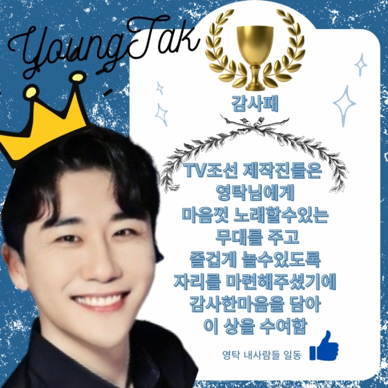 가수 영탁의 팬들이 지난 1년 6개월 영탁을 사랑해준 TV조선 제작진에게 온라인 감사패로 감사를 전했다.