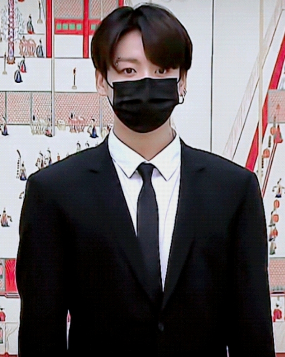 당일 정국은 블랙 수트를 입고 성숙한 남성미를 물씬 풍기며 눈부신 꽃미남 비주얼도 뽐내 팬심을 설레게 했다.