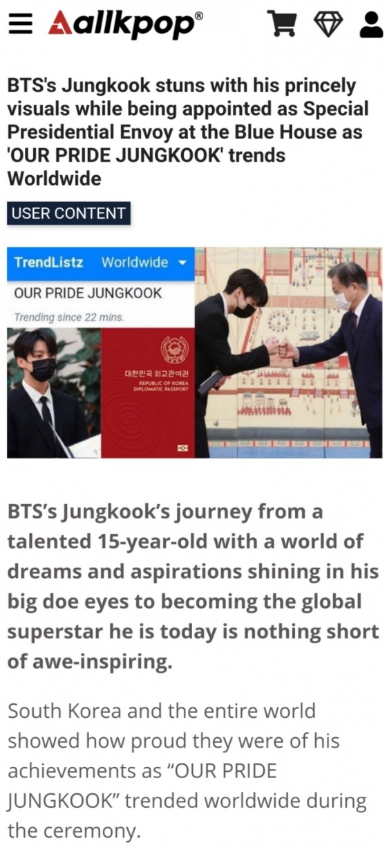 이에 당일 특별사절 임명장을 받은 소식이 전해지자 트위터에서는 'OUR PRIDE JUNGKOOK'의 문장을 담은 트윗이 쏟아지며 해당 키워드가 월드와이드(전세계) 트렌드에 오르는 등 전세계 팬들의 응원의 목소리가 이어졌다.