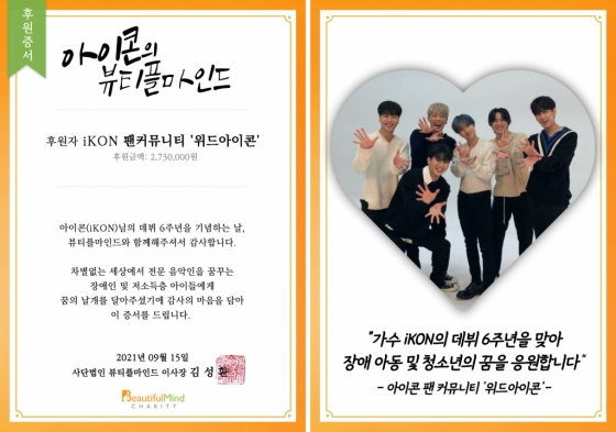 '위드아이콘'은 "아이콘 데뷔 6주년이라는 뜻깊은 날을 의미 있게 기념하고자 뷰티플마인드에 기부를 결정했다"라며 "팬들의 자발적인 참여로 십시일반 모은 후원금이 아이콘의 이름으로 음악인을 꿈꾸는 아이들의 미래를 응원할 수 있어 매우 감사하다"고 전했다.