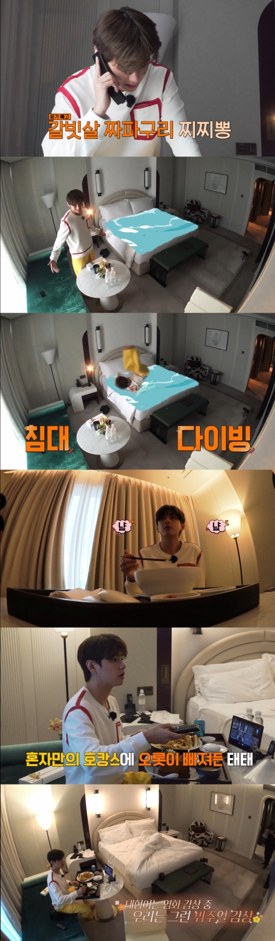 방탄소년단은 정해진 순서에 맞춰 주문을 시작했고 호텔방에서의 휴식을 즐기며 호캉스를 각자 나름대로 즐기는 모습을 보였다. 뷔 역시 메뉴를 고르고 영화를 보며 호캉스의 매력을 선사했다.