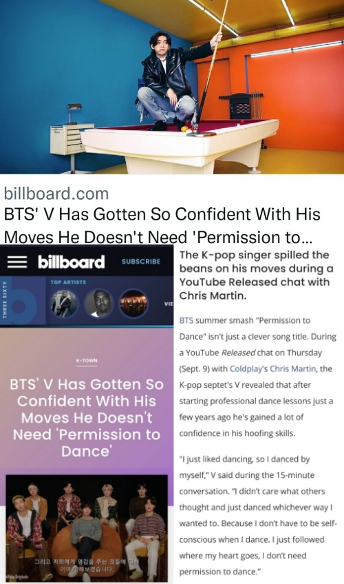 빌보드는 "BTS V가 댄스에 자신감을 얻으면서 댄스에는 허락이 필요 없게 됐다"는 기사를 통해 뷔와 크리스 마틴이 댄스는 "스스로 자유로워지며 마음이 가는대로 하는 것이 중요하다"며 서로 공감하는 인터뷰를 실었다.
