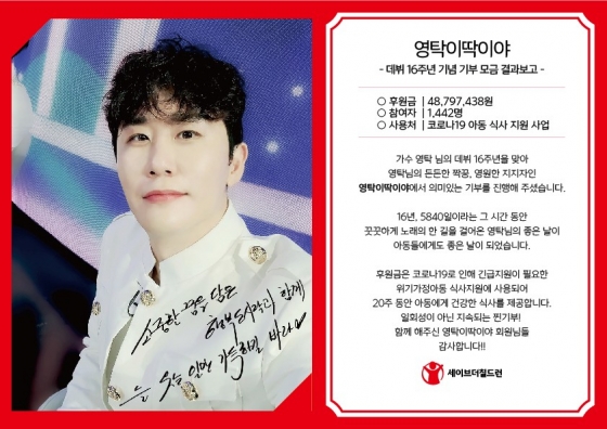 가수 영탁의 데뷔 16주년(9월 12일)을 맞아 팬들이 코로나19로 어려움에 처한 아동들의 식사 지원을 위한 기부로 선한 영향력을 실천했다.