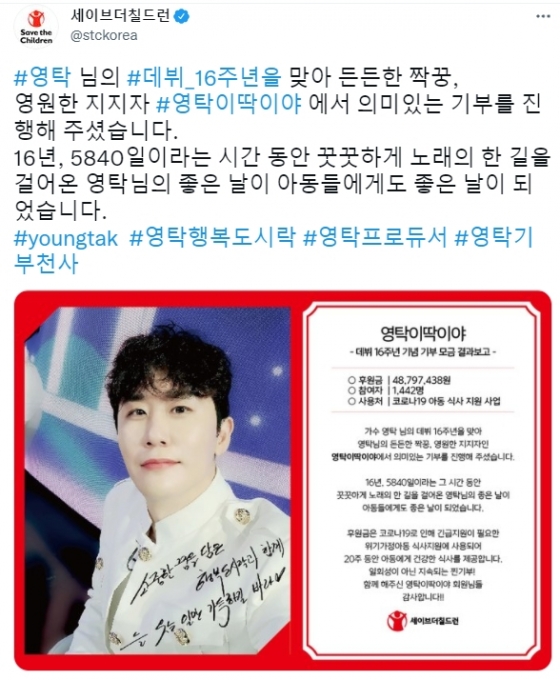 세이브더칠드런은 공식 SNS를 통해 "영탁 님의 데뷔 16주년을 맞아 든든한 짝꿍, 영원한 지지자 '영탁이 딱이야'에서 의미 있는 기부를 진행해주셨다"며 "16년, 5840일이라는 시간 동안 꿋꿋하게 노래의 한 길을 걸어온 영탁 님의 좋은 날이 아동들에게도 좋은 날이 됐다"고 밝혔다.