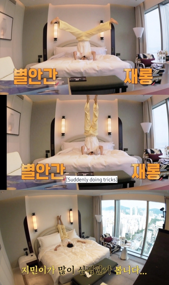 잠시 혼자만의 시간에서 지민은 침대에 거꾸로 물구나무 서기와 다리 벌리기로 유연한 몸을 뽐내며 귀여움 한도초과된 모습을 보여 웃음짓게했다.