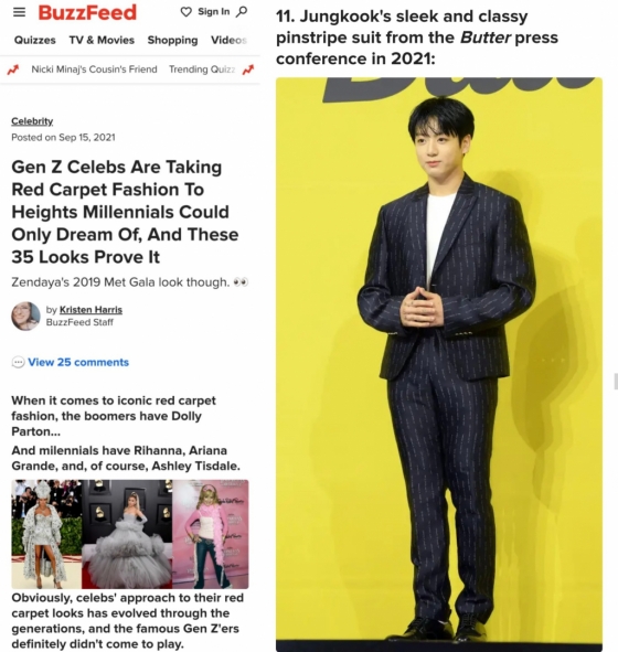 매체는 정국의 사진과 함께 '2021년 'Butter'(버터) 기자 회견 정국의 매끈하고 세련된 핀스트라이프 정장' 이라는 소개를 덧붙였다.