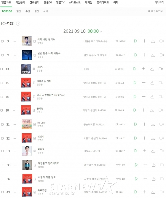 임영웅은 9월 18일 오전 8시 기준 멜론 TOP 100 차트에 총 12곡을 랭크시켰다.
