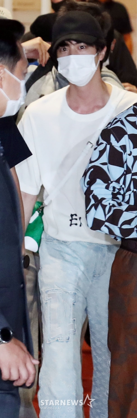 인천국제공항 출국장에서는 오랜만의 기자들의 배웅 속에 손을 흔들며 인사를 남기는 진의 모습이 카메라에 가득 담겼고, 진은 지난 루이비통 쇼에서 '쇼스토퍼', '클로징 모델', '루이비통의 얼굴'로 이름을 남겼던 모델답게 검은 모자와 마스크를 쓰고 루이비통 흰 티와 청바지에 초록 가방을 크로스로 메고 출국장에 나타났다.
