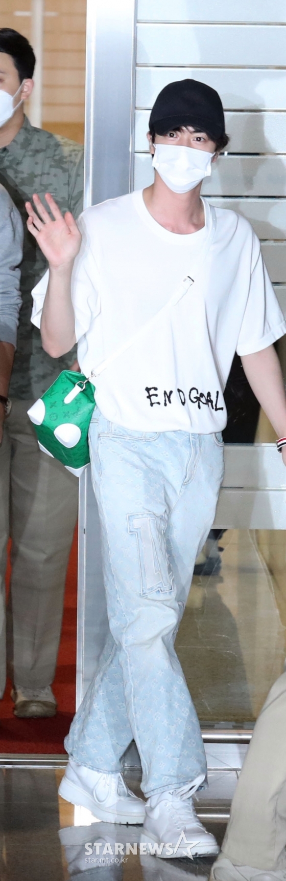 방탄소년단(BTS) 진이 1년 7개월 만에 공항패션을 선보이며 화려하게 '특사 김석진'으로 출국했다. 진은 팬들을 위한 '뿅' 인사도 잊지 않았다.