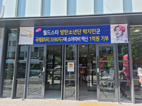 국제로타리 3590지구(Rotary DISTRICT 3590)에 따르면 지민은 국제로타리 3590지구에 소아마비 백신 1억 원을 기부했다.