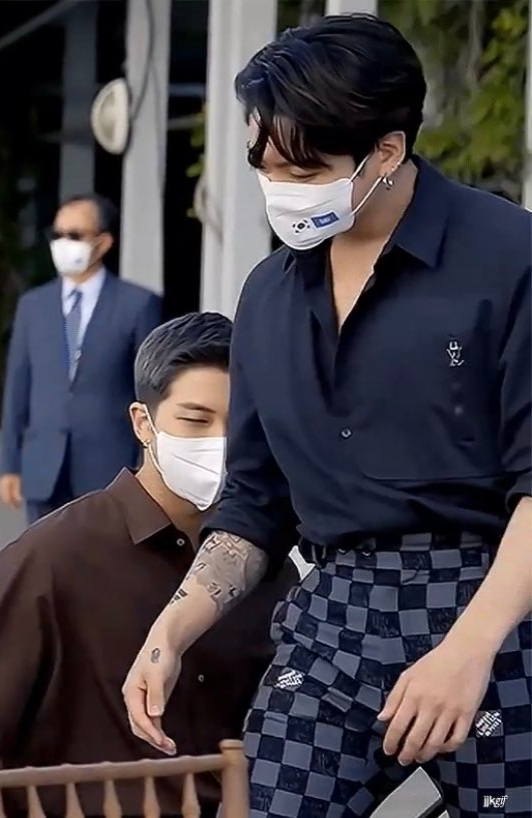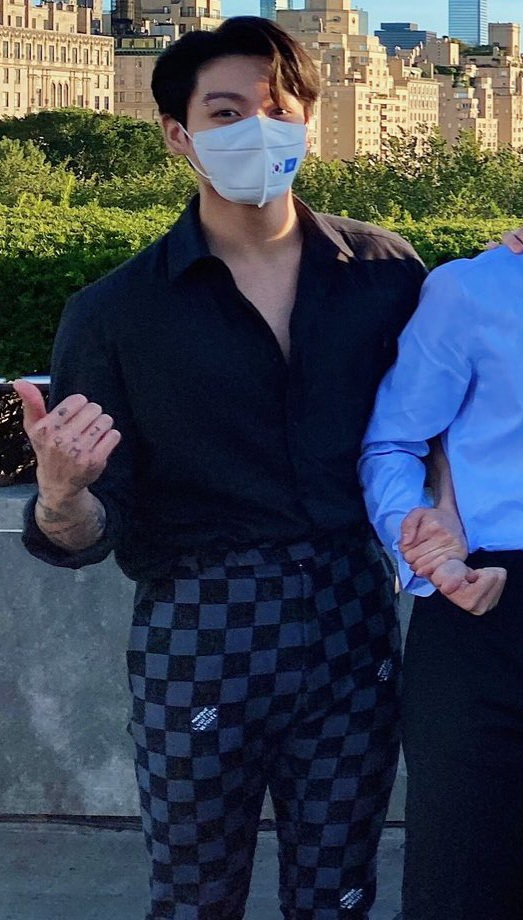 이날 정국은 앰배서더로 활동하고 있는 명품 브랜드 루이 비통의 깔끔한 블랙 셔츠와 다미에 에벤 패턴이 돋보이는 화려한 바지를 입고 범접 불가한 슈퍼스타의 포스와 영앤리치 아우라를 내뿜으며 시선을 압도했다.