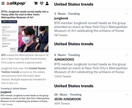 트위터 미국 실시간 트렌드에는 메트로폴리탄 미술관 방문 관련 멤버 정국의 키워드 'jungkook'이 3위, 'JUNGKOOK'이 8위에 이름을 올렸다.