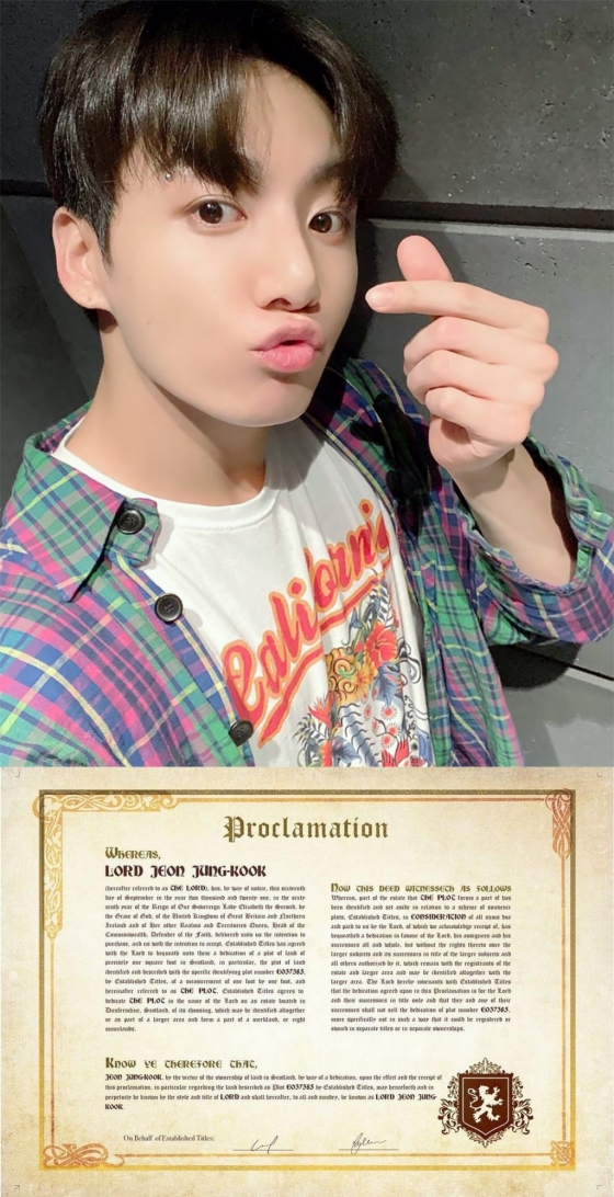 이는 스코틀랜드 자연 보호 구역을 위한 기금 마련의 일환으로 'Highland Titles Nature Reserve'(하이랜드 티틀스 자연보호지역)에 위치한 땅을 구입했다는 인증서이며 이로 인해 정국은 '영주 전정국'이라는 새로운 칭호를 얻게 됐다.