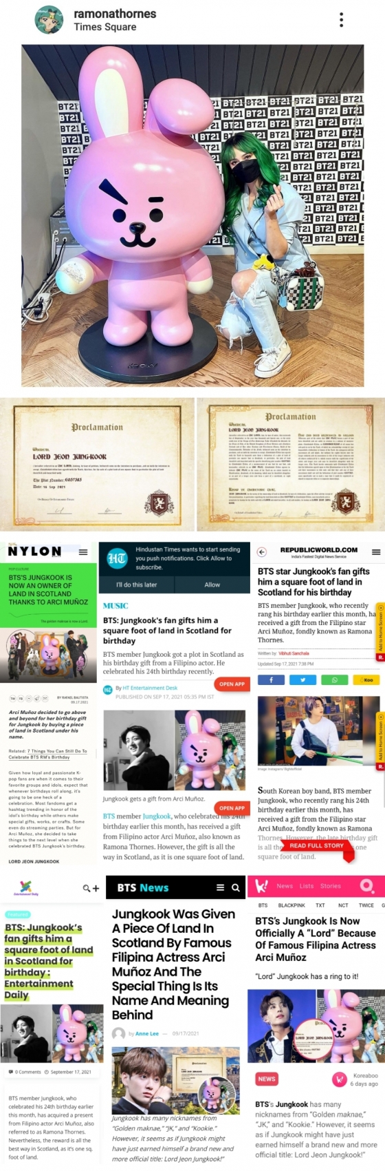 최근 필리핀의 유명 가수 겸 여배우 아르시 무뇨스(Arci Munoz)가 정국의 이름으로 땅을 사면서 '영주 전정국'이라는 칭호를 얻게 되어 화제를 모았다.