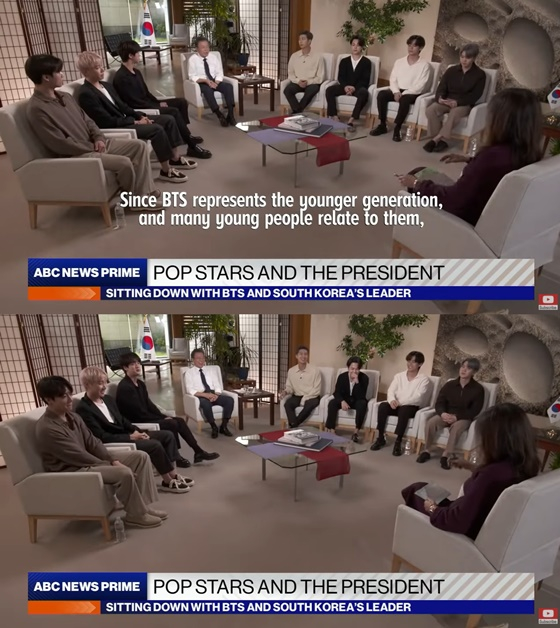 방탄소년단은 24일(이하 현지시간) 방송된 인기 아침 프로그램 ABC '굿모닝 아메리카'와 심야 뉴스 프로그램 '나이트라인'에 연이어 출연했다. 한국계 주주 장(Juju Chang) 앵커와의 인터뷰 형식으로 방송에 출연한 방탄소년단은 유엔 특사 활동 소감을 비롯해 팬데믹 극복, 미래세대와의 소통, 오프라인 공연에 대한 갈증 등에 대한 견해를 피력했다. 인터뷰에는 방탄소년단을 특사에 임명한 문재인 대통령도 함께 출연했다.