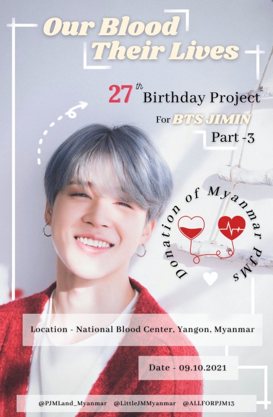 미얀마의 지민 팬 베이스 '지민 미얀마'(JIMIN LAND Myanmar), 'LittleJMMyanmar', 'ALLFORPJM13'는 지민의 생일 프로젝트의 일환으로 팬들과 함께 헌혈에 참여했다고 알렸다.