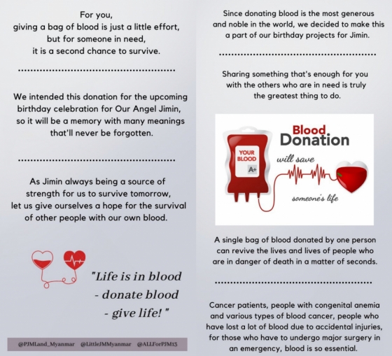이들은 '헌혈은 세상에서 가장 관대하고 고귀하기 때문에 지민을 위한 생일 프로젝트로 진행하게 되었다'며 미얀마에서 가장 큰 도시이자 산업 및 상업, 무역의 중심지인 양곤에 위치한 국립 혈액 센터에서 50여명이 헌혈에 동참했다고 전했다.