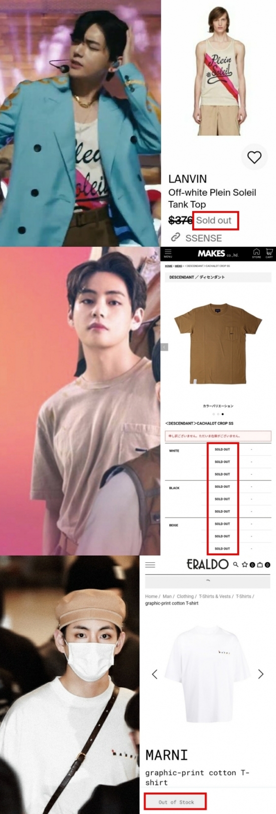 방탄소년단(BTS) 뷔가 착용한 의상들이 연이어 품절리스트에 이름을 올리며 '품절킹' 면모를 과시했다.