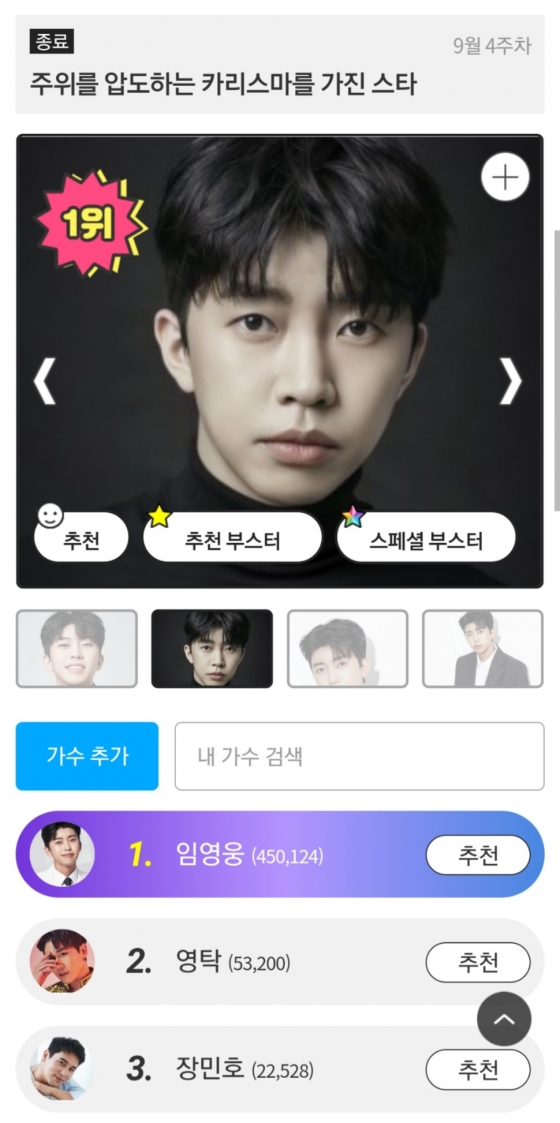 연예K-POP임영웅 '주위 압도 카리스마 스타' 1위..득표도 '압도적'발행 : 2021.09.27 ・ 17:00문완식 기자가수 임영웅이 '주위를 압도하는 카리스마를 가진 스타' 1위에 올랐다.임영웅은 팬앤스타 포토톡 '주위를 압도하는 카리스마를 가진 스타' 투표에서 45만 124표로 1위를 차지했다.2위와 40만표 가까이 차이나는 압도적 득표다.1위에 오른 사진에서 임영웅은 무심한 듯 시크한 카리스마로 눈길을 사로잡았다.문완식 기자(munwansik@mt.co.kr)<저작권자 © 스타뉴스, 무단전재 및 재배포 금지>임영웅영웅시대AAA추천 기사문완식 기자기자홈좋아요 연예-K-POP의 인기 급상승 뉴스연예-K-POP의 최신 뉴스