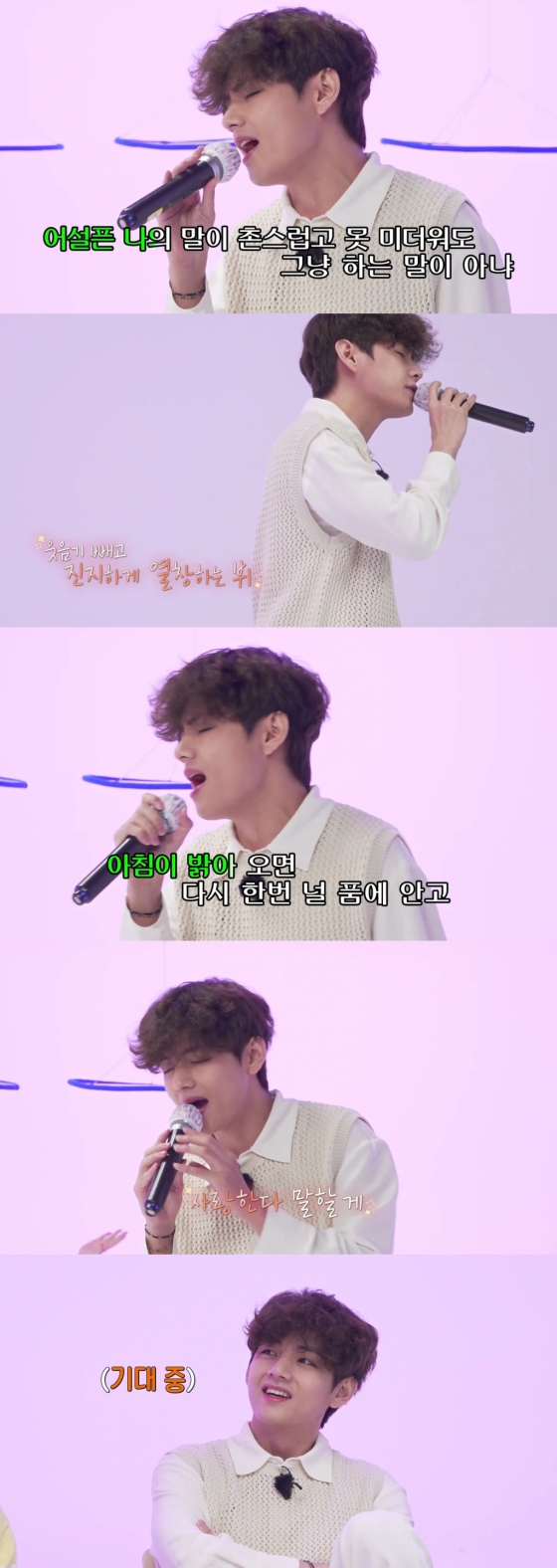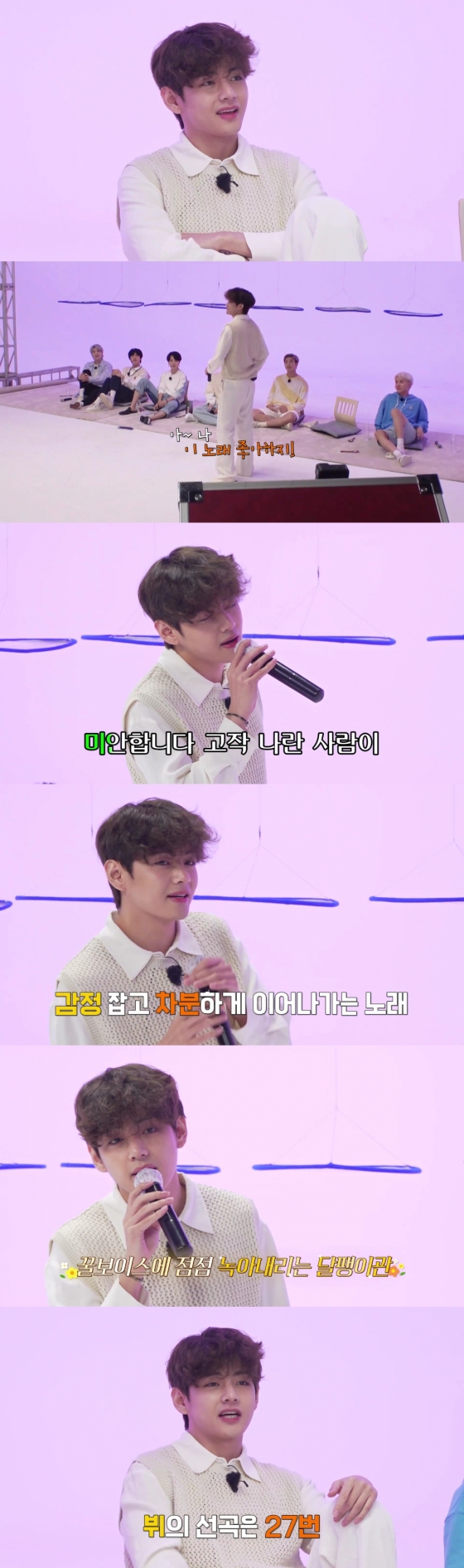 멤버 RM이 버즈의 '겁쟁이'를 선곡하자 학창 시절 버즈의 팬이라고 밝혔던 뷔는 "나 이 노래 좋아하지"라며 도전에 나섰다. 뷔는 곧바로 차분하게 감정을 잡고 노래를 부르기 시작했고, 부드러운 저음과 흔들리지 않는 풍부한 고음으로 귀를 사로잡았다. 완벽한 곡 소화로 멤버들은 물론 팬들도 환호하며 SNS를 뜨겁게 달궜다.