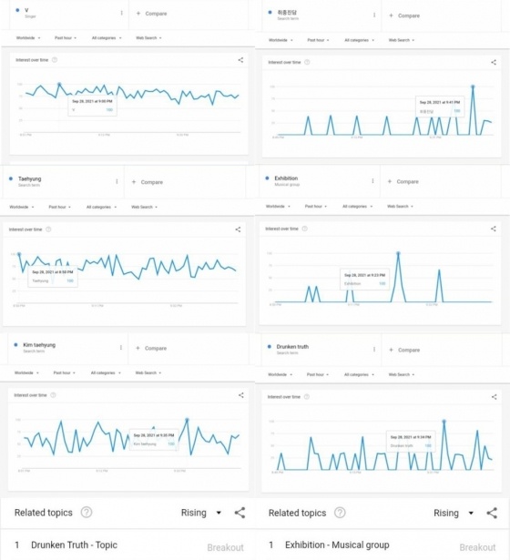 뷔가 '취중진담'을 부른 후 한국 트렌드 1위, 월드와이드 트렌드 26위에 올랐고, 구글트렌드에서도 '뷔(V)', 'Taehyung', 'Kim Taehyung', '취중진담', 'Exhibition(전람회)', 'Drunken truth'의 검색량이 최고점에 도달하며 폭발적인 화제성을 입증했다. 또한 연관검색어로 'Exhibition', 'Drunken Truth'가 너무 많아 수치를 계산할 수 없는 'Breakout'을 기록, '취중진담'은 멜론 인기 급상승 키워드에도 등극하며 뜨거운 관심을 받았다.