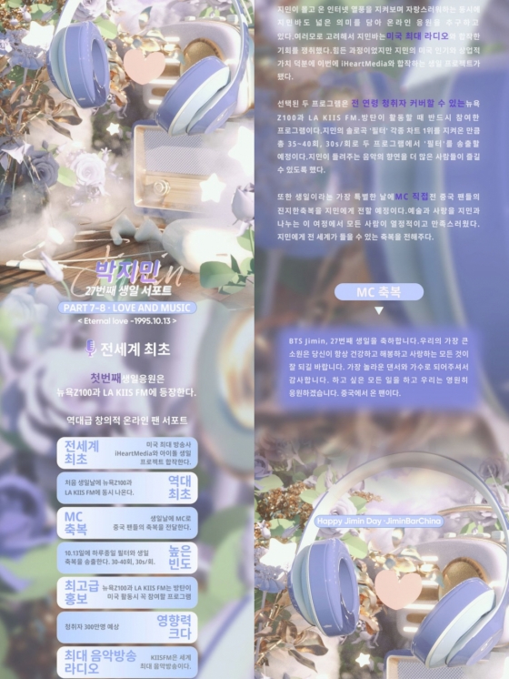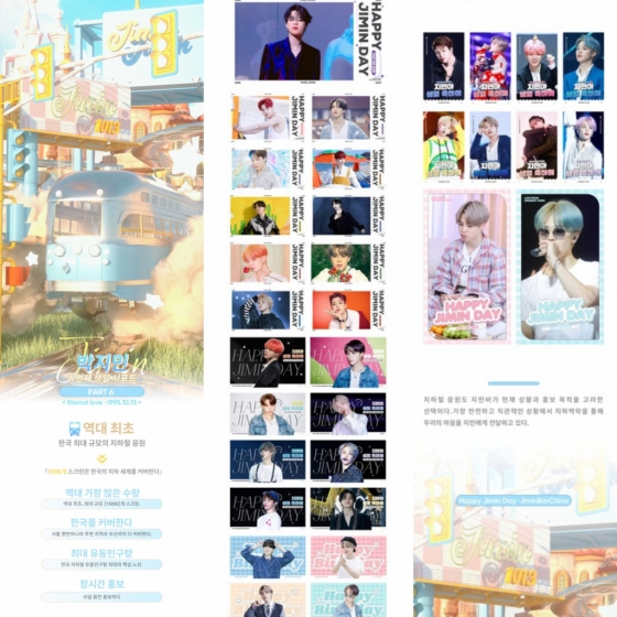 지민의 중국 대형 팬덤 '지민바 차이나'(JIMIN BAR CHINA)는 지민의 27세 생일을 맞아 상상초월 생일 축하 이벤트를 최초로 이뤄냈다.