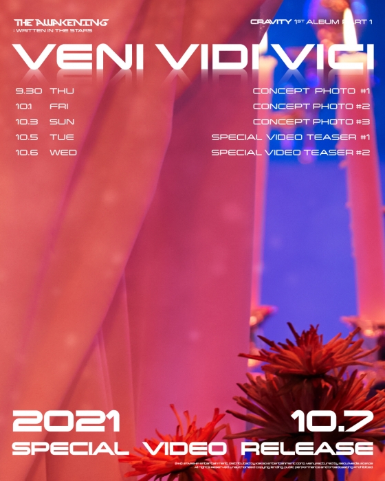 나날이 상승 가도를 달리고 있는 크래비티가 'VENI VIDI VICI'로 터트릴 포텐에 기대감이 더해지는 가운데, 크래비티는 10월 7일 'VENI VIDI VICI' 스페셜 비디오를 공개하고 후속 활동을 시작한다.