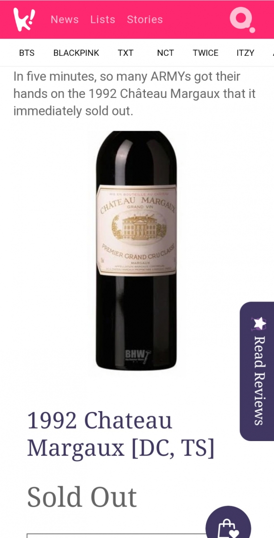 북미매체 코리아부에 따르면 뷔가 선택한 2001년산은 최고가 2350달러(한화 약 278만원)에 이르는 고가의 와인이며 구하기도 쉽지 않았다. 이에 팬들은 차선책으로 같은 브랜드의 1992년산 와인을 찾아내기에 이른다.