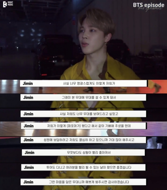 지민은 "그래미 어워드 본 무대에 단독으로 설 수 있게 돼서 영광이다", "무대를 보여드리고 싶었고, 저희가 퍼포머가 돼서 팬들이 같이 기뻐해 주셨을텐데 성원에 보답하기 위해 열심히 하고 있다"며 "빨리 상황이 좋아져서 투어도 다니고 여러분을 빨리 뵐 수 있는 날이 왔으면 좋겠다"고 전했다.