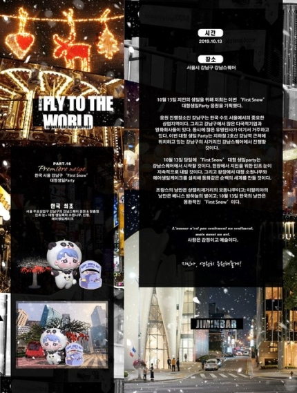 시작은 2019년 눈을 좋아하는 지민을 위해 강남 한복판에 지민을 닮은 대형 인형과 에어 생일케이크를 설치, 제설기로 생일인 13일에 첫눈을 선물해 수백명의 팬들이 몰려, 생일축하 노래를 부르며 동화같이 아름다운 이벤트를 대성공 시켰다.