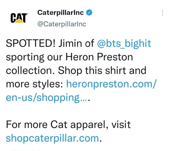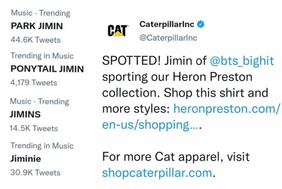 품절 행진을 몰고온 지민의 티셔츠는 미국 유명 중장비업체 캐터필라와 헤론프레스톤(hp)의 컬래버레이션 제품으로, 흰색 바탕에 지민의 솔로곡 '세렌디피티'의 상징색인 노랑색의 'CAT' 레터링이 되어있어 미소년 이미지를 더욱 부각시키는 스타일링으로 이목을 끌었다.