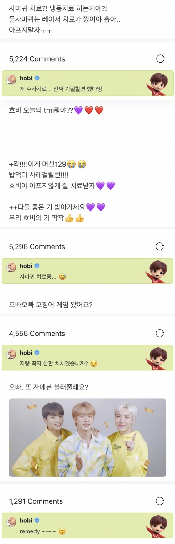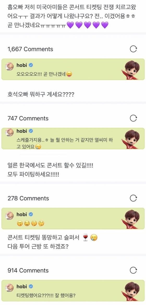 제이홉은 팬소통에도 나섰다. 제이홉은 면접에 간다는 팬의 글에 "파이팅! 좋은 결과 있기를"이라고 응원했고, 방탄소년단 미국 콘서트 티켓 예매에 성공했다는 팬에게는 "오오오오오! 곧 맏나겠네"라고 기대감을 나타냈다. 지금 뭐하냐는 팬의 질문에는 "늘 뭘 안하는 거 같지만 열심히 하고 있어요"라고 댓글을 달아 이를 보는 팬들을 미소 짓게 했다.
