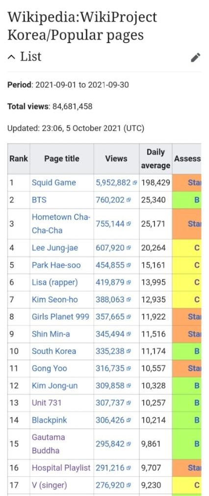 6월, 7월, 8월에는 3개월 연속 한국 연예인 개인 페이지 뷰 1위로 비교불가 우위를 점령했고, 위키피디아가 서비스되기 시작한 2015년 7월부터 2021년 9월까지 전 세계 누적 페이지뷰에서는 2,119만건으로 K팝 스타 중 최고 뷰수를 기록하며 최고의 화제성과 파급력을 증명했다.