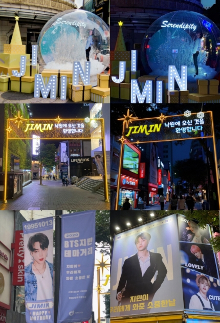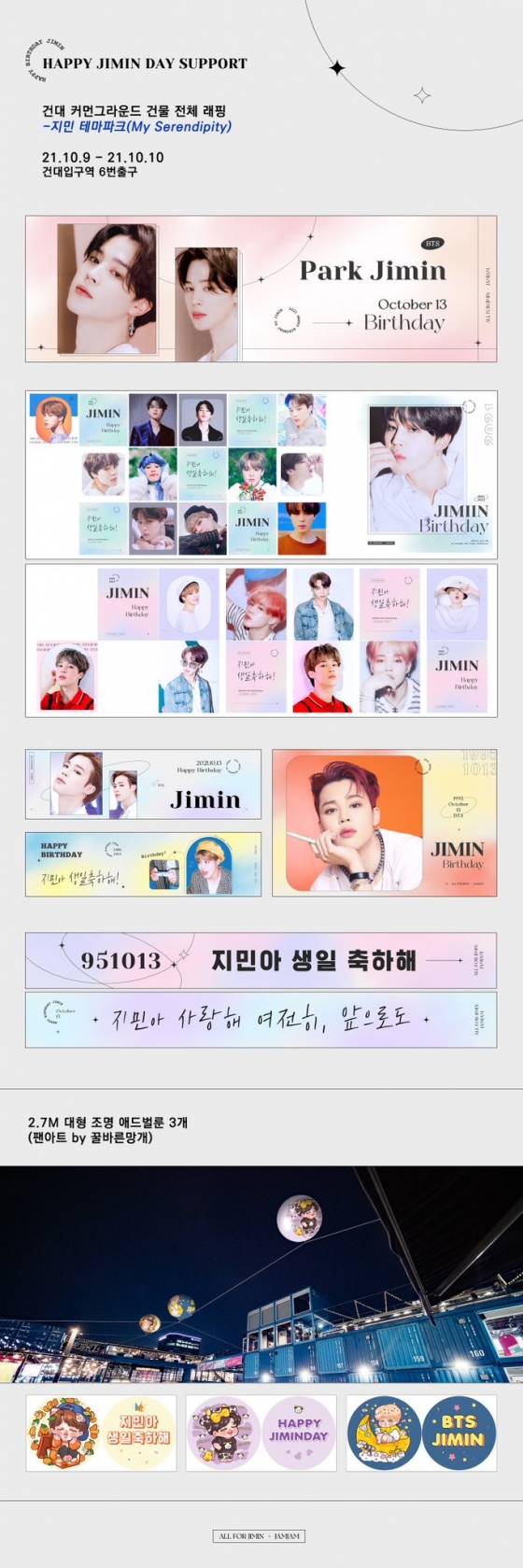 올포지민은 지민의 생일을 기념해 이곳에 35개의 초대형 현수막과 대형 조명, 애드벌룬을 제작해 지민과 팬들을 위한 환상적 테마파크를 조성했다.