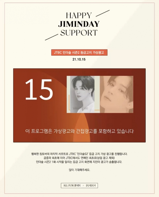 지민의 대형 국내 팬덤인 올포지민코리아는 오늘 15일 첫 방송되는 예능 리얼리티 프로그램 JTBC '인더숲 BTS편 시즌2' 1화의 시작을 알리는 등급 고지 가상 광고를 진행한다고 지난 11일 밝혔다.