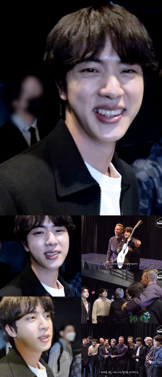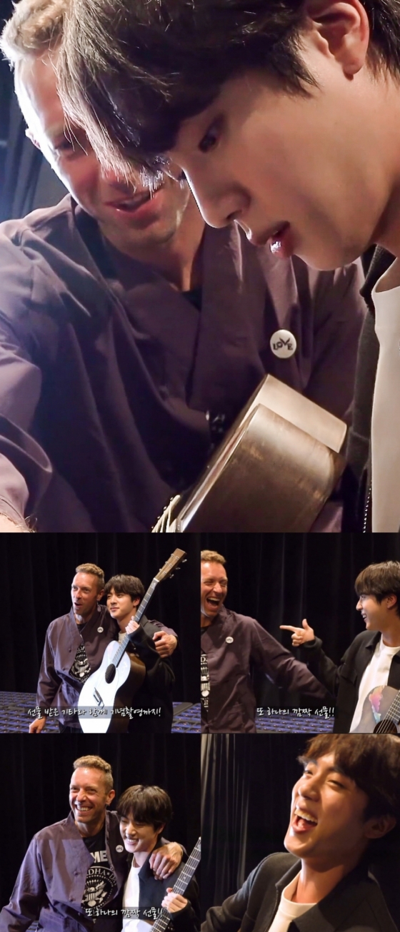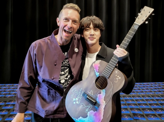 자신의 플레이 리스트에 콜드플레이의 노래를 추천했으며 팬이기도 한 진에게 크리스 마틴이 오랜시간 무대에서 연주하던 최애 기타를 선물로 준 일은 국경을 초월한 아티스트들의 순수한 만남과 우정에 빛을 더했다.