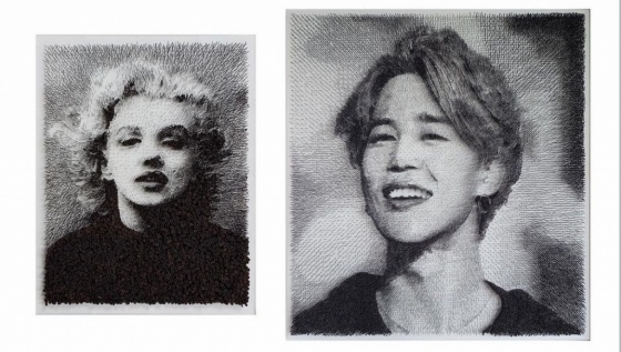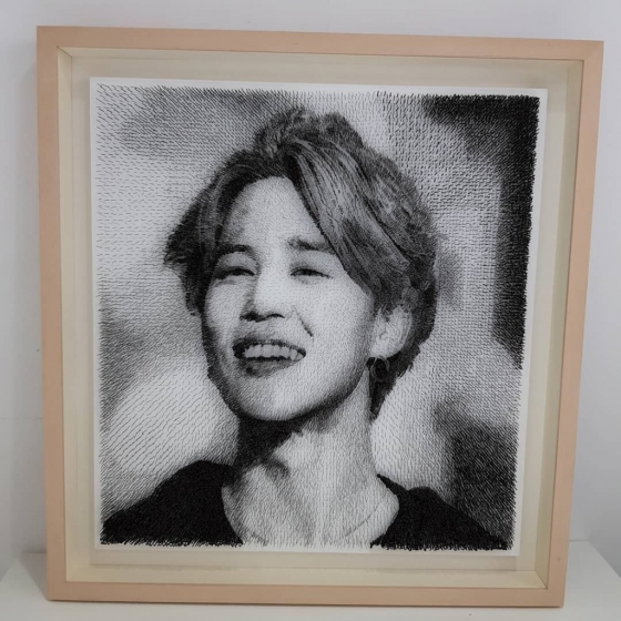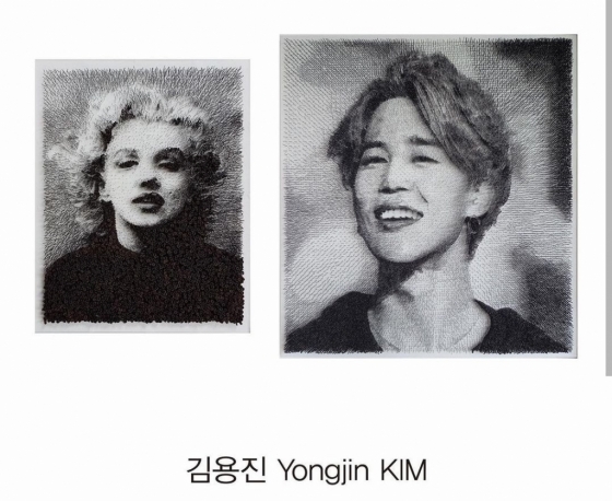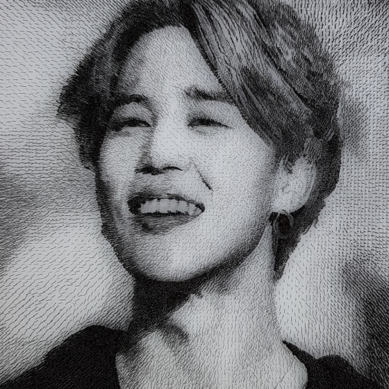 지민을 모티브로 한 이번 작품은 캔버스에 다양한 크기와 굵기의 철심을 붙이고 꼬아 만든 독특한 형식의 작품으로, 딱딱하고 차가운 소재의 느낌과 대비되는 지민의 따뜻하고 아름다운 미소가 관람객들의 눈길을 사로잡으며 입소문을 타며 유명세를 떨치고 있다.