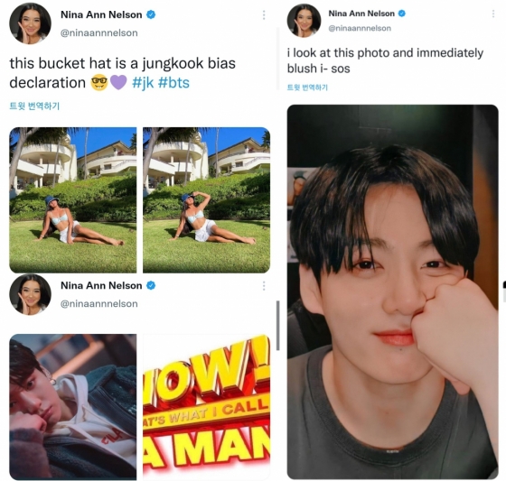 니나 앤 넬슨은 'this bucket hat is a jungkook bias declaration♥ #jk #bts'(이 버킷햇(벙거지모자)은 정국 최애라는 공개적인 고백이야♥ #jk #bts) 라는 글과 사진 2장을 게재했다.