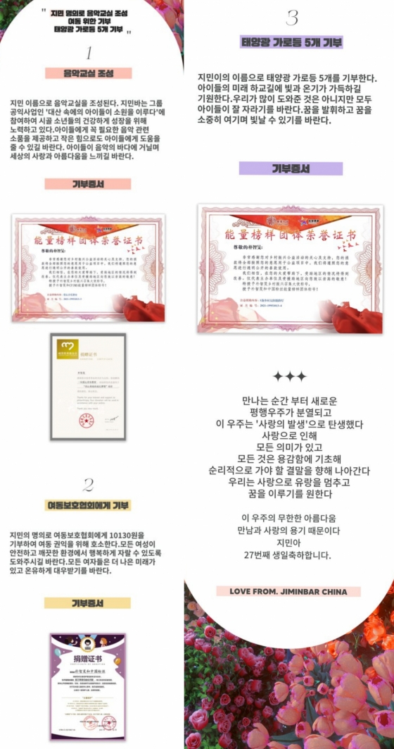 마지막으로 '아이들의 하교길에 빛과 온기가 가득하길 바란다', '모든 아이들이 잘 자라 꿈을 이루며 꿈을 소중히 여기며 빛날 수 있길 바란다'며 태양광 가로등 5개 기부소식을 전한 지민바 차이나는 '이 우주가 아름다운 것은 무한한 사랑의 용기때문이다. 지민의 27번째 생일을 축하한다'는 시적 표현으로 지민에 대한 애틋한 팬 사랑을 담았다.