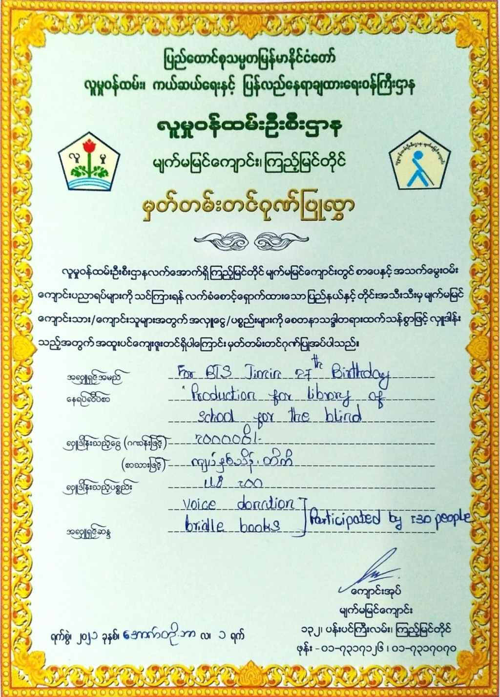양곤(Yangon)에 위치한 맹아 학교에 '박지민의 이름으로 점자 도서 및 소설을 포함한 130여편의 오디오 파일과 기부금을 전달했다'고 알렸다.