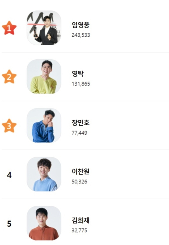 이번 스타랭킹 스타트롯 남자 2위는 영탁이 차지했다. 영탁은 13만1865표를 얻었다. 또 장민호가 7만7449표를 얻어 3위를 기록했다. 이어 이찬원이 4위(5만326표), 김희재가 5위(3만2775표)에 올랐다.
