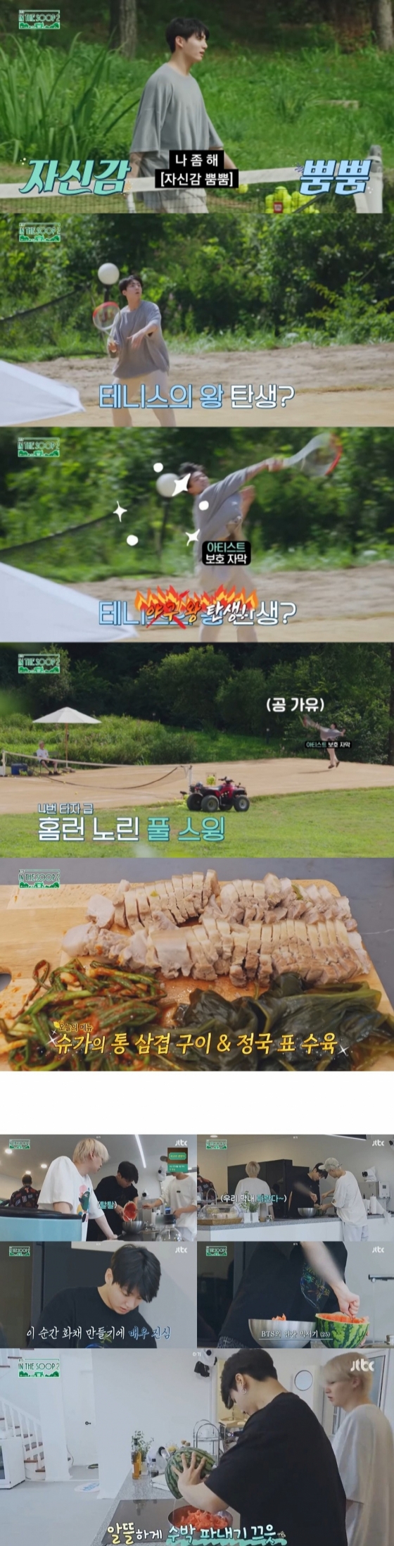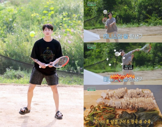 팬들은 "정구기 테니스 치면서 꿀잼 예고 본방사수" "야구왕 왠지 병맛일 듯ㅎㅎ벌써 웃겨" "정국이 아침 일찍 형들 밥 짓고 화채부터 요리에 진심이던데 수육 기대된다" "테니스 요리 꿈나무♥" "정국이 넘치는 힘ㅋㅋ테니스에서 홈런 침" "정국이 승부욕 불타서 막판에 테니스 잘 칠듯 ㅋㅋ" "황금 막내 정구긴데~" "숨은 요리 능력자 정국이 못하는 게 뭐야" "강아지 육아도 잘해 요리도 잘해 최고" 등 반응을 나타냈다.