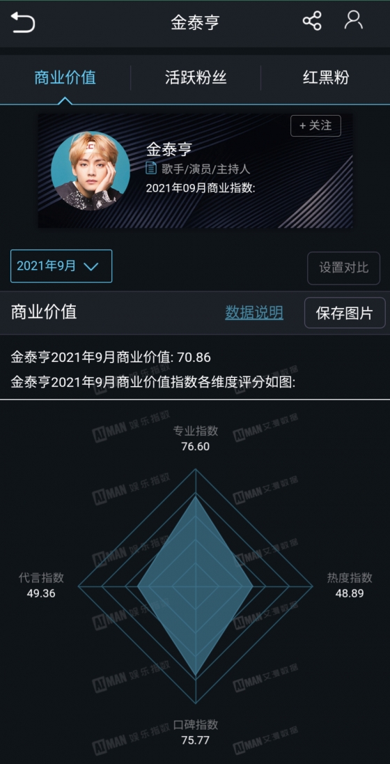 뷔는 중국내 연예인의 상업적 가치를 평가하는 '아이만 상업가치지수'(Aiman Commercial Value Index)에서 9월 팀내 최고점인 70.86점을 받았다.